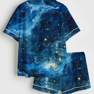 Women’s Summer Seashell Blue Coastal Summer Beach Crab Seahorse Print Short Sleeve Satin Pajama Set