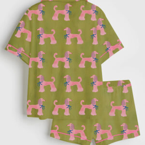 Women’s Pink Poodle Whimsical Playful Mid Century Modern Pet Short Sleeve Satin Pajama Set