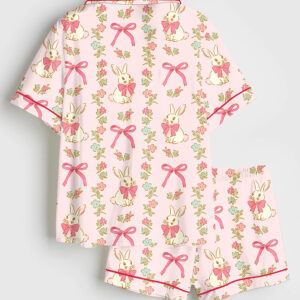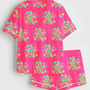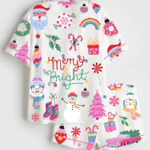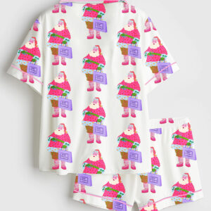 Women’s Preppy Pink Christmas Character Merry And Bright Short Sleeve Silky Satin Pajama Set