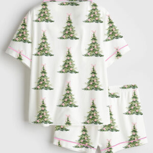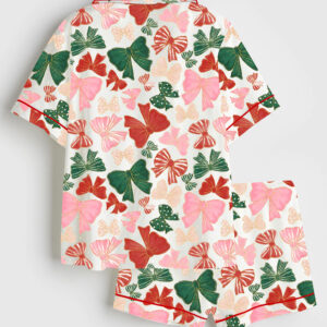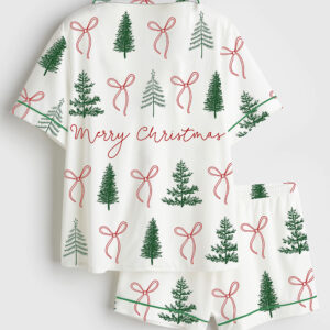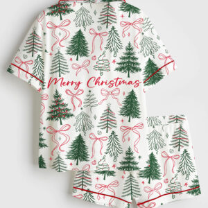 Women’s Preppy Christmas Tree Coquette Bow Merry Christmas Short Sleeve Silky Satin Pajama Set