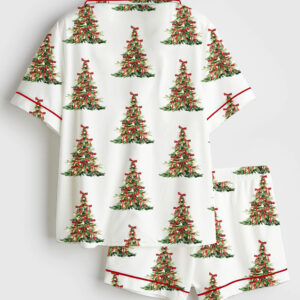 Women’s Preppy Red Grandmillenial Coquette Christmas Tree Short Sleeve Satin Pajama Set