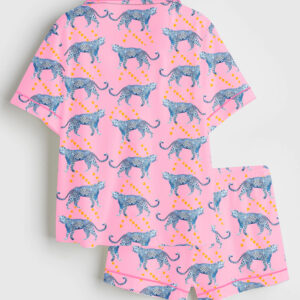 Women’s Pink Cosmic Cheetah Watercolor Cheetah Wildlife Print Short Sleeve Satin Pajama Set