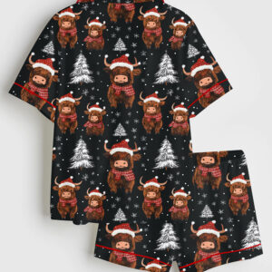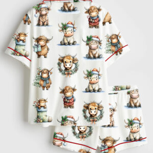 Women’s Christmas Highland Cow Short Sleeve Satin Pajama Set