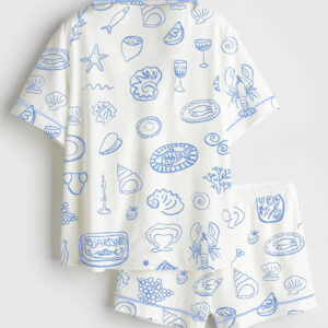 Women’s Coastal Hand Drawn Beach Ocean Elements Summer Nautical Print Short Sleeve Satin Pajama Set
