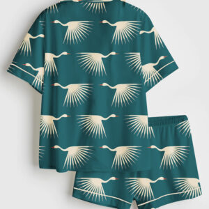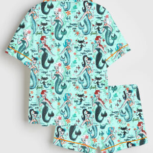 Women’s Aqua Retro Mermaids Teal Pinup Girls Martini Mermaids Short Sleeve Satin Pajama Set