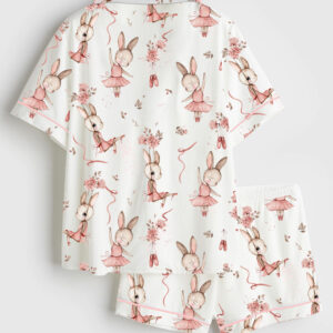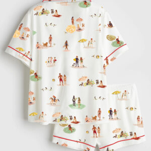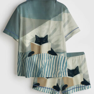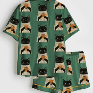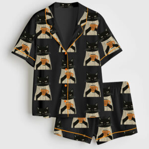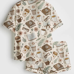 Women’s Beige Coffee And Books Reading Lover Girly Bookish Print Short Sleeve Satin Pajama Set
