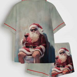 Women’s Bathroom Christmas Santa Humor Festive Holiday Wine Lover Short Sleeve Satin Pajama Set
