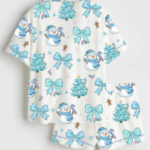 Women’s Blue Brushstroke Snowman Winter Coquette Christmas Tree Short Sleeve Silky Satin Pajama Set