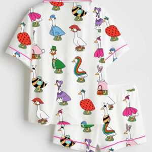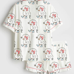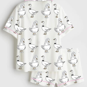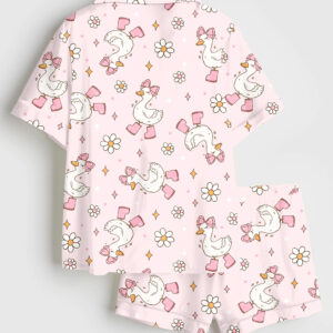 Women’s Silly Goose Repeating Goose Pattern Cute Pink Duck Print Short Sleeve Satin Pajama Set