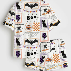 Women’s Skeleton Halloween Pumpkin Halloween Bat Ghost Boo Cat Print Short Sleeve Satin Pajama Set