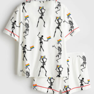 Women’s Skeleton Pride Rainbow LGBTQ Funny Gay Pride Print Short Sleeve Satin Pajama Set