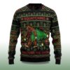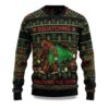 This sweater features Bigfoot wandering around a Christmas tree, surrounded by a striking green, red, and gold pattern. Snowflakes and festive motifs adorn the background, creating a classic holiday feel with a unique twist. The knit fabric is warm and comfortable, while the ribbed hem and cuffs keep the shape all day. Designed for both men and women, it’s perfect for relaxing evenings, holiday dinner parties, or ugly sweater contests.