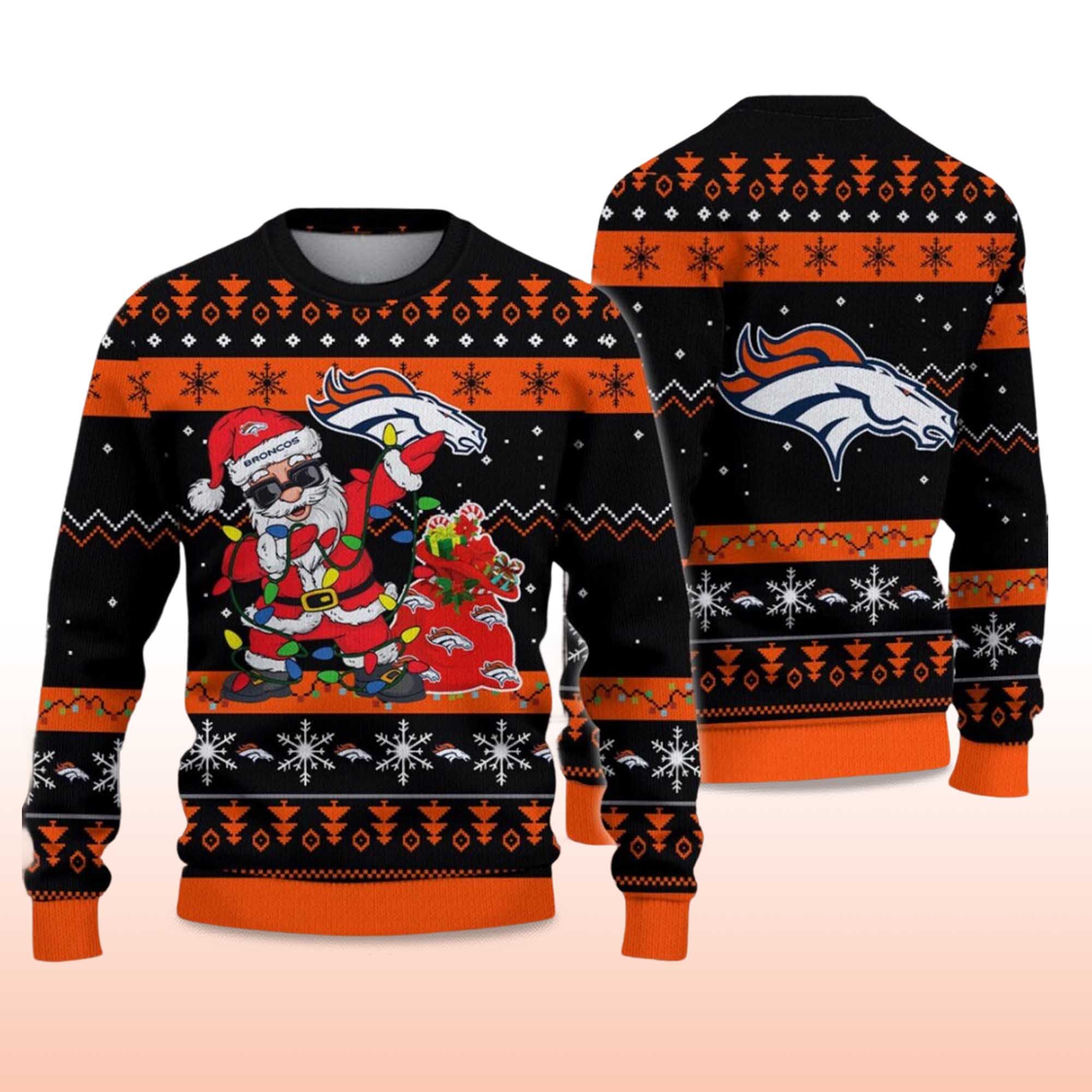 The 2025 Broncos Santa Claus Ugly Christmas Sweater turns your holiday attire into a celebration of Denver pride. Santa Claus stands proudly in Broncos colors, holding the team logo against an orange and navy print. Snowflakes, zigzag trim, and bright accents highlight the design while keeping the Christmas spirit alive. This sweater is fun, cozy, and full of team energy—perfect for a holiday watch party or dinner party.