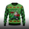 This sweater is bright green with diamond patterned sleeves, decorated with tractors, snowflakes and holiday symbols. In the middle, the image of Santa Claus riding a tractor with the words “Christmas is better on the farm” is presented in a humorous and sincere style. The warm, all-day wool makes this a versatile choice for the holidays.