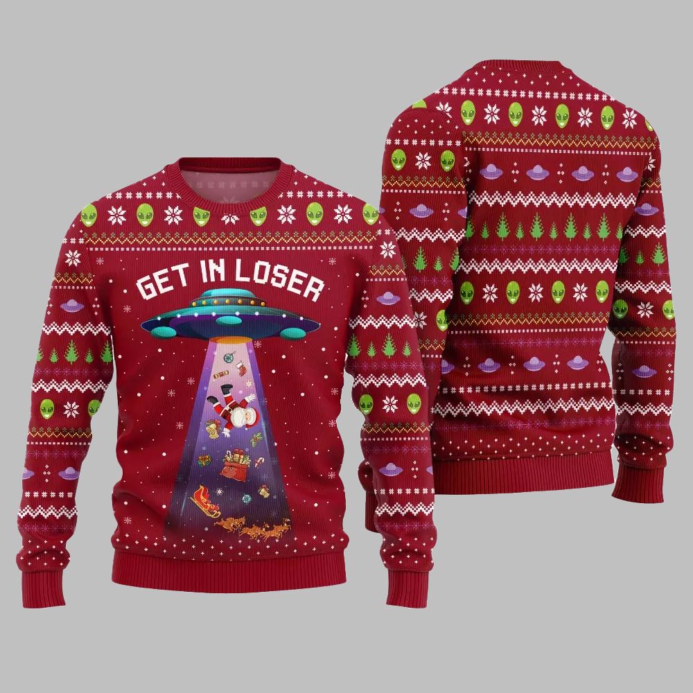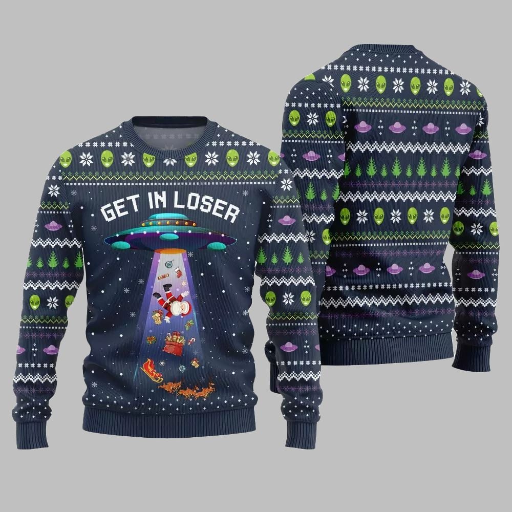 Our 2025 Christmas Alien UFO Ugly Christmas Sweater is here to abduct you from the world of boring holiday parties and transport you to a universe of unparalleled fun. The centerpiece of this cosmic creation is a scene straight from a sci-fi Christmas comedy: a massive, brilliantly lit UFO hovering over a winter landscape, its tractor beam pulling in a very surprised Santa Claus, his sleigh, and all the presents! Emblazoned with the sassy, iconic phrase “GET IN LOSER,” this sweater is the perfect blend of nerdy charm and irreverent holiday humor.