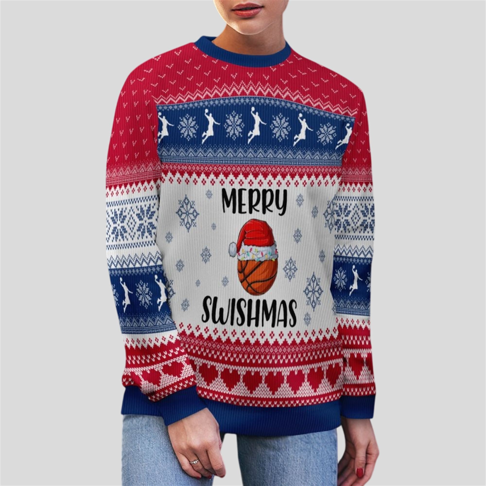 Our 2025 “Merry Swishmas” design is a level above the generic holiday apparel. The vibrant red, white, and blue color palette is classic and eye-catching. The sweater is woven with traditional Fair Isle patterns, but with a unique athletic twist. Look closely, and you’ll see snowflakes, festive hearts, and even silhouettes of reindeer mixed with tiny basketball players frozen in a perfect jump-shot pose. This intricate detail makes it a true high-quality garment, not just a gag gift. It’s the perfect way to represent your sport while staying perfectly on-theme for the holidays.