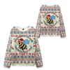 This sweater’s design is a masterclass in holiday charm. Front and center is an irresistibly cute cartoon bee, beaming with joy and sporting a classic red Santa hat. This little mascot is surrounded by the cheerful, curving text “Oh Christmas Bee, Buzzing With Joy!”