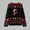 The design is rendered in a classic, pixelated knit style that pays homage to the beloved ugly Christmas sweater tradition. Intricate patterns of Christmas trees, snowflakes, and festive motifs in shades of red and white create a vibrant contrast against the deep black background, ensuring you look perfectly festive while celebrating your love for hilariously mischievous cats.