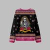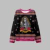 At the heart of this sweater is a stunningly detailed graphic that blends traditional iconography with contemporary satire. A serene, Santa Muerte-inspired skeleton, adorned with a radiant halo and sugar skull makeup, embodies a sense of calm spirituality. But look closer—instead of a sacred relic, she holds a smartphone, capturing the moment in a divine selfie. This clever twist is a nod to our hyper-connected lives, even amidst moments of reflection. Flanked by blooming red roses and the all-seeing Eye of Providence, the scene is tied together with a bold banner proclaiming what we’re all feeling: “Blessed & Stressed.” The vibrant pink, rich gold, and deep black hues ensure this intricate design pops, making you the center of attention at any holiday gathering.