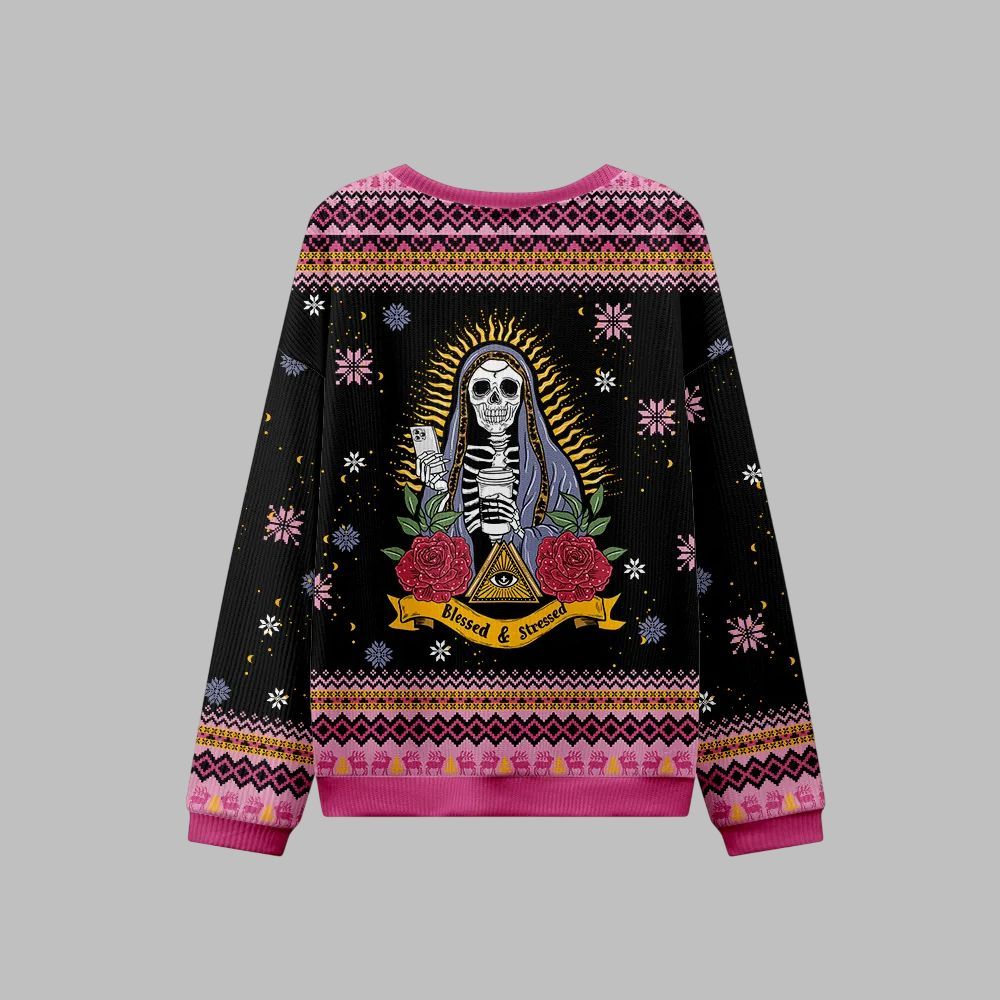 At the heart of this sweater is a stunningly detailed graphic that blends traditional iconography with contemporary satire. A serene, Santa Muerte-inspired skeleton, adorned with a radiant halo and sugar skull makeup, embodies a sense of calm spirituality. But look closer—instead of a sacred relic, she holds a smartphone, capturing the moment in a divine selfie. This clever twist is a nod to our hyper-connected lives, even amidst moments of reflection. Flanked by blooming red roses and the all-seeing Eye of Providence, the scene is tied together with a bold banner proclaiming what we’re all feeling: “Blessed & Stressed.” The vibrant pink, rich gold, and deep black hues ensure this intricate design pops, making you the center of attention at any holiday gathering.