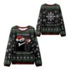 The front of this sweater features a charmingly mischievous black cat, complete with a festive Santa hat, proudly presenting its latest find: a bone tied with a holiday ribbon. Below this adorable scene, the witty phrase “I FOUND THIS HUMERUS” delivers a clever anatomical pun that’s sure to get a laugh. The main greeting, “MERRY CAT-MAS!,” cleverly replaces “Christ-mas” with “Cat-mas,” instantly connecting with cat lovers everywhere. The design is set against a classic black background adorned with intricate “ugly sweater” patterns, including green and white snowflakes, reindeer, and geometric borders. The festive cheer continues on the back, which features a large, beautifully detailed snowflake and a traditional “Merry Christmas” greeting, ensuring you look festive from every angle.
