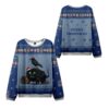 This isn’t just a piece of clothing; it’s a wearable piece of art that tells a story. The front of this vibrant blue sweater showcases a wonderfully grumpy-looking, fluffy black cat, whose wide, green eyes express pure holiday bewilderment. He’s become an unwilling Christmas decoration, hilariously entangled in a string of colorful festive lights and surrounded by perfectly wrapped presents. Perched atop his head, wearing a tiny Santa hat of its own, is a clever crow, proudly holding a stolen golden bell in its beak. This delightful duo creates a scene of festive mischief that is sure to spark conversations and spread laughter wherever you go.