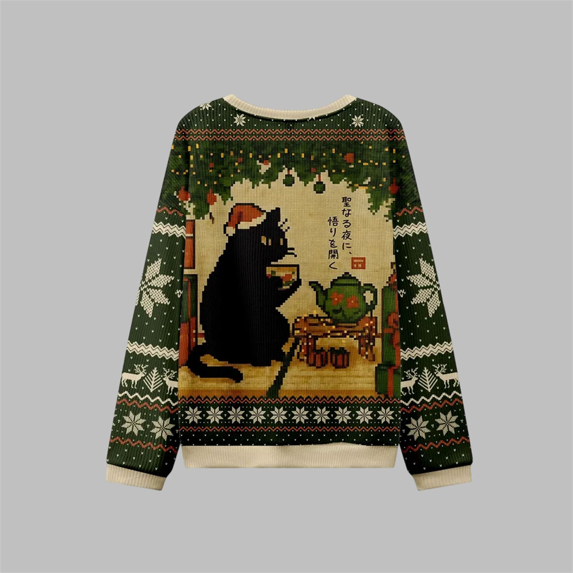 The centerpiece of this sweater is a captivating pixel art design featuring a sleek black cat, adorned with a tiny Santa hat, seated gracefully on a tatami mat. The cat holds a small teacup, partaking in a quiet moment of reflection beside a traditional Japanese teapot. This intricate scene is set against a backdrop of what appears to be a cozy room with bookshelves, creating an atmosphere of warmth and contentment.
