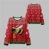 The centerpiece of this vibrant red sweater is a charming black cat, comfortably snug in a fuzzy yellow and black bee costume, complete with delicate wings and a tiny Santa hat perched jauntily on its head. This adorable “Catbee” isn’t just flying solo; it’s carrying a small glowing lantern, inside which a tiny hamster friend, also wearing a Santa hat, is along for the festive ride. This intricate and imaginative illustration is set against a classic holiday backdrop, featuring repeating patterns of snowflakes, reindeer, and Christmas trees that scream yuletide joy. The rich red base is perfectly accented with bold green trim on the collar, cuffs, and waistband, creating a timeless Christmas color palette that feels both nostalgic and refreshingly new.
