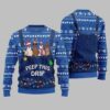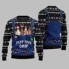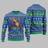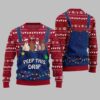 This sweater’s genius lies in its clever and detailed design. The main graphic features a quartet of the coolest chickens you’ve ever seen, each rocking their own festive gear, including Santa hats and slick sunglasses. They’re casually perched in the pocket of a hyper-realistic, printed-on pair of denim overalls. The phrase “PEEP THIS DRIP” is emblazoned on the bib, using a playful pun that connects chicken “peeps” with modern slang for great style (“drip”). To complete the look, the overalls are adorned with a string of colorful, glowing Christmas lights, adding an extra layer of festive brilliance. The sleeves and back feature a timeless navy blue and white snowflake and geometric pattern, grounding the hilarious central image in a cozy, traditional Christmas sweater aesthetic.