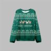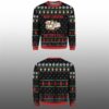 The design features a rich tapestry of deep blues, festive reds, and wintery whites, woven into classic Fair Isle-inspired patterns. But look closer, and you’ll see the delightful details: rows of charming white cow silhouettes prancing between intricate snowflakes and geometric shapes. The front and back both showcase the star of the show: a cheerful, friendly cow sporting a bright red Santa hat, ready to celebrate. Emblazoned in a bold, festive font is the hilarious pun “HAVE A DAIRY CHRISTMAS,” ensuring you’re the center of attention and cheer.