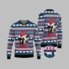 The design features a rich tapestry of deep blues, festive reds, and wintery whites, woven into classic Fair Isle-inspired patterns. But look closer, and you’ll see the delightful details: rows of charming white cow silhouettes prancing between intricate snowflakes and geometric shapes. The front and back both showcase the star of the show: a cheerful, friendly cow sporting a bright red Santa hat, ready to celebrate. Emblazoned in a bold, festive font is the hilarious pun “HAVE A DAIRY CHRISTMAS,” ensuring you’re the center of attention and cheer.