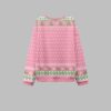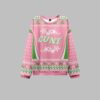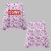 The sweater features a dazzling, eye-catching pink base, punctuated by vibrant green accents on the shoulders and classic Nordic-inspired patterns along the hem and cuffs. Traditional festive elements like pixelated reindeer, delicate snowflakes, and Christmas trees are artfully integrated, creating a familiar holiday feel that serves as the perfect setup for the shocking centerpiece: the word “CUNT,” emblazoned across the chest in a stylized, star-spangled font. This is where festive tradition meets modern rebellion.