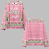 The sweater features a dazzling, eye-catching pink base, punctuated by vibrant green accents on the shoulders and classic Nordic-inspired patterns along the hem and cuffs. Traditional festive elements like pixelated reindeer, delicate snowflakes, and Christmas trees are artfully integrated, creating a familiar holiday feel that serves as the perfect setup for the shocking centerpiece: the word “CUNT,” emblazoned across the chest in a stylized, star-spangled font. This is where festive tradition meets modern rebellion.