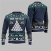Set against a vibrant royal blue backdrop, the centerpiece is a perfectly stacked Christmas tree made entirely of glistening white golf balls, topped with a brilliant gold star. Flanking this magnificent “tree” are two cheerful green golf carts, ready to zip across the winter wonderland. The classic ugly sweater aesthetic is perfected with whimsical patterns of reindeer, snowflakes, and festive icons along the chest, cuffs, and hem, creating a look that is both hilarious and stylishly chaotic. This is the ultimate conversation starter, guaranteed to bring laughs and admiration at any holiday event.