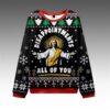 Arched above this iconic figure in bold, unmissable white lettering is the word “DISAPPOINTMENTS,” followed by “ALL OF YOU” directly below. The humor is immediate and undeniable. But what makes it a true “ugly sweater” is the meticulous detail. The design mimics a traditional knit pattern, complete with: