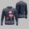 This sweater immediately catches the eye with its brilliant royal blue base, a refreshing departure from the typical holiday colors. Front and center is the star of the show: a cheerful pink flamingo, decked out in its holiday best. Sporting a classic Santa hat and tangled in a string of glowing Christmas lights, this bird isn’t just celebrating; it’s leading the carol service with the clever pun “FA LA LA MIN GO” displayed proudly beside it. The design is perfectly framed with traditional Nordic-inspired patterns of snowflakes and, of course, more flamingos, creating a seamless blend of classic Christmas and quirky tropical vibes.