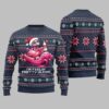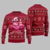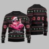The sweater showcases a pink flamingo, seemingly enjoying the holiday spirit, possibly adorned with a Santa hat or scarf, and surrounded by classic Christmas elements like snowflakes, hearts, and potentially even a whimsical holiday beverage. The prominent text “I’M FEELIN’ PRETTY IN PINK” adds a fun and catchy slogan that perfectly encapsulates the sweater’s playful vibe. The overall design is intentionally “ugly” in the traditional Christmas sweater sense, featuring a bold and somewhat chaotic arrangement of colors and patterns, making it the perfect attire for ugly sweater parties and lighthearted holiday events.