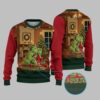 Every detail of this sweater is designed for maximum festive impact. The traditional “ugly sweater” patterns are cleverly reimagined with a grilling theme. Bands of crossed spatulas and forks, roasted turkeys, and sauce bottles adorn the chest, sleeves, and back, creating a cohesive and comical design. The cuffs, collar, and waistline are accented with a fiery flame pattern set against a warm yellow-orange backdrop, perfectly tying the whole sizzling theme together. The bold text “Grillin’ & Chillin’ WITH SANTA” leaves no doubt about your holiday mood. Crafted for both style and comfort, this sweater lets you celebrate the season in a way that’s authentically you.