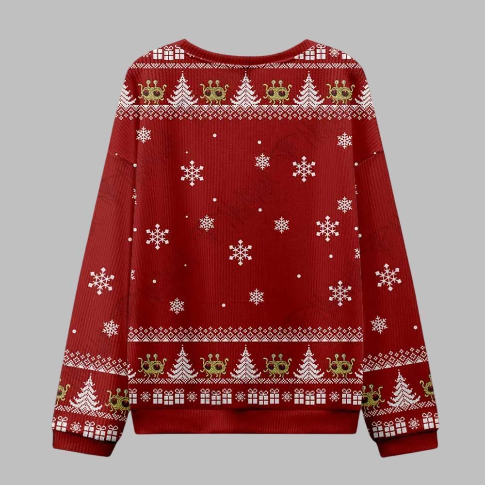 The centerpiece of this vibrant red sweater is the beloved Flying Spaghetti Monster, reimagined for the Christmas season. Adorned with a classic Santa hat and comically tangled in a string of colorful Christmas lights, this pasta-based deity is here to wish you the sauciest of holidays. The phrase “HAVE A SAUCY HOLIDAY” is emblazoned in a bold, festive font, perfectly complementing the central design. The entire piece is framed with classic ugly sweater patterns, including rows of snowflakes, Christmas trees, and gift boxes, seamlessly blending traditional aesthetics with a brilliant, satirical twist.