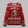 Step into the holiday season with our 2025 Christmas Have a Saucy Holiday Ugly Christmas Sweater, the perfect apparel for anyone looking to add a generous helping of fun and flavor to their festive wardrobe. This masterfully designed sweater captures the chaotic joy of the holidays with a uniquely hilarious and eye-catching graphic that’s destined to be the star of any party.