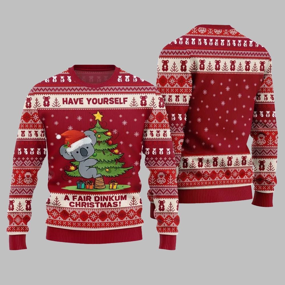This sweater’s design is centered around an adorable, Santa-hat-wearing koala clinging to a beautifully decorated Christmas tree. Below this charming scene, the classic Aussie phrase “A FAIR DINKUM CHRISTMAS!” is proudly displayed, instantly setting a tone of genuine, no-nonsense festive fun. The design is framed by intricate, Nordic-inspired patterns that seamlessly integrate tiny koala motifs, blending traditional ugly sweater aesthetics with a unique Australian theme. The rich black, festive red, and crisp white color palette ensures you look stylishly seasonal.