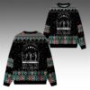 What truly sets this 2025 sweater apart is its intricate border pattern. Moving away from traditional Nordic designs, this “ugly sweater” features stunning geometric, folk-inspired art on the cuffs, hem, and shoulders. The vibrant pops of ethereal teal, muted pink, and warm orange create a stunning, almost tribal or boho-goth contrast against the black, ensuring this design is visible from across the room.