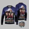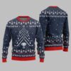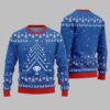 The centerpiece of this vibrant green sweater is a cleverly designed Christmas tree constructed entirely from iconic hockey equipment. Two crossed hockey sticks form the trunk, with more sticks branching out to create the classic tree shape. The ornaments? They’re exactly what you’d hope for: hockey gloves, skates, and pucks dangle from the “branches,” all leading up to the ultimate tree-topper—a championship trophy cup. Surrounded by traditional patterns of snowflakes, reindeer, and fir trees, this design perfectly balances holiday cheer with hardcore hockey pride.