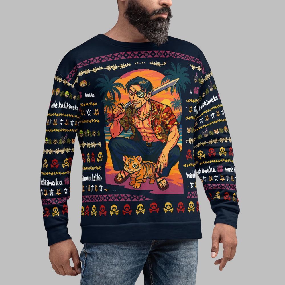 But the details don’t stop there. The sleeves and body are adorned with meticulously crafted patterns that subvert classic Christmas sweater tropes. Instead of holly and ivy, you’ll find repeating bands of hibiscus flowers, mischievous skulls and crossbones, tropical bats, and the cheerful text “Mele Kalikimaka”—the Hawaiian way of saying “Merry Christmas.” This intricate, all-over print ensures you’ll look exceptional from every angle.