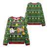 The vibrant green backdrop is a canvas of classic holiday cheer, intricately woven with festive patterns like snowflakes, Christmas trees, and geometric designs, capturing the quintessential “ugly sweater” aesthetic. The centerpiece of this masterpiece is a charmingly illustrated tuxedo cat, complete with a confident expression, sharing a celebratory fist bump. Encircling this heartwarming scene are the bold words, “Most Pawsome Cat Dad Ever,” crowned with shining golden stars. This unique and humorous design instantly sets it apart, making it the ultimate attire for holiday parties, family photos, and cozy nights in with a furry friend.