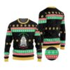 Every detail of this sweater is a nod to the legendary film. The centerpiece features a beautifully rendered, 8-bit-style graphic of the Nakatomi Plaza tower, instantly recognizable to any enthusiast. Emblazoned above and below are the words “NAKATOMI PLAZA” and “CHRISTMAS PARTY 1988,” commemorating the event that changed holiday action films forever. The design is framed by classic ugly sweater patterns, including festive red and green bands with pixelated snowflakes and golden starbursts that cleverly mimic the film’s explosive moments. The black base color makes the vibrant details pop, while the yellow-gold collar, cuffs, and hem add a retro touch that screams late ’80s.
