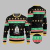 Every detail of this sweater is a nod to the legendary film. The centerpiece features a beautifully rendered, 8-bit-style graphic of the Nakatomi Plaza tower, instantly recognizable to any enthusiast. Emblazoned above and below are the words “NAKATOMI PLAZA” and “CHRISTMAS PARTY 1988,” commemorating the event that changed holiday action films forever. The design is framed by classic ugly sweater patterns, including festive red and green bands with pixelated snowflakes and golden starbursts that cleverly mimic the film’s explosive moments. The black base color makes the vibrant details pop, while the yellow-gold collar, cuffs, and hem add a retro touch that screams late ’80s.