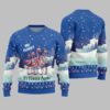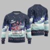The front proudly displays a group of charming flamingos, huddled together in a snowy landscape, exclaiming “OH FLOCK! It’s Winter Again” – a sentiment many of us can relate to! The whimsical scene is set against a backdrop of snow-dusted pine trees and falling snowflakes, creating a picturesque yet humorous winter wonderland. The back of the sweater continues this enchanting theme, featuring a sprawling, serene winter forest scene, dotted with delicate snowflakes, extending the festive magic all around. The sleeves and lower hem are adorned with playful Christmas tree and gift box motifs, adding intricate details that complete the festive look.