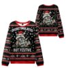 The design is printed on a premium black sweatshirt base, making the festive reds, greens, blues, and yellows of the lights pop. The “ugly sweater” pattern is flawlessly integrated, featuring rings of snowflakes, geometric holiday patterns, and even tiny “passed-out” raccoons near the cuffs and hem for an extra layer of humor. This is the conversation-starter you’ve been looking for.