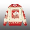 The sweater features a classic, cozy cream-colored base, accented with festive red sleeves, a crewneck collar, and waistband. The traditional “ugly sweater” pattern of snowflakes, bells, and geometric shapes provides the perfect Christmas canvas. But the centerpiece is what truly sets it apart: a high-definition print of the viral cat, framed in red, with “Ibuprofen” printed boldly below. To complete the aesthetic, the Japanese katakana for Ibuprofen (イブプãƒãƒ•ェン) is featured prominently, adding an extra layer of authentic meme-style randomness.